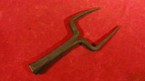 GREAT ANTIQUE BLACKSMITH''S IRON FORMING TOOL WITH FORKED PRONGS - SQUARED TOP