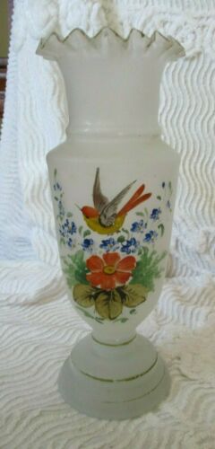 Vintage Frosted Glass Hand Painted Blown flower & bird 12" pedestal vase