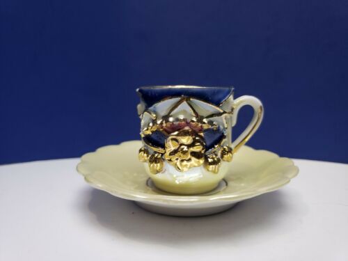 Title (ebay affiliate link): Very Small Demitasse Cup & Saucer ~Raised Artwork ~ Blue and Gold ~