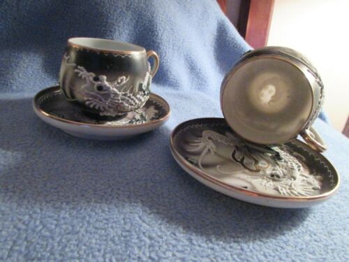 2 Vintage Dragon ware lithophane in cup bottom oriental demi cup and saucer sets