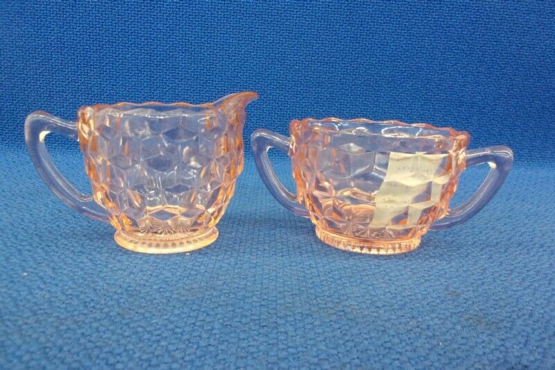 Title (ebay affiliate link): Vintage Pink Cube Pattern Depression Glass Creamer and Sugar Bowl Jeanette 1930s