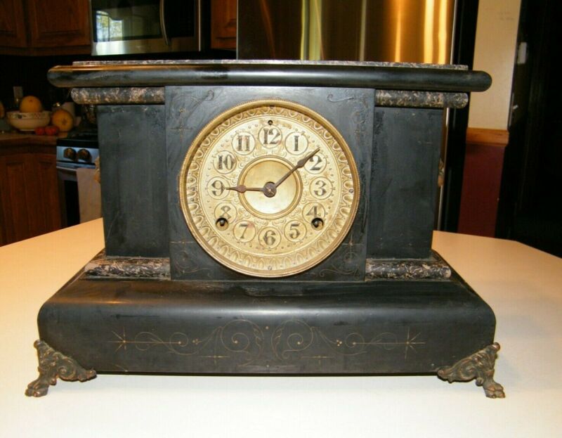 Title (ebay affiliate link): ANTIQUE SETH THOMAS ADAMANTINE BLACK MANTLE CLOCK W/ LIONS HEADS