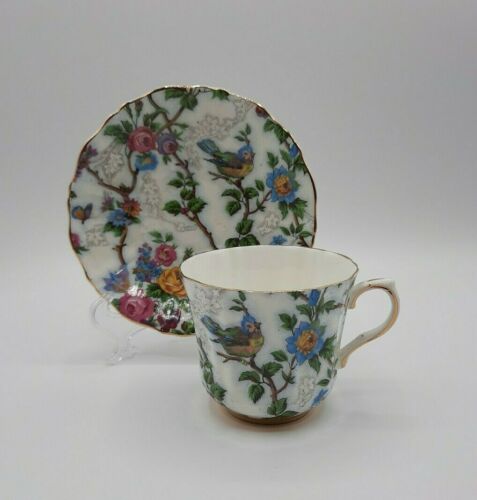 Vintage Old Royal Bone China England Teacup Saucer Roses Bird on a Branch