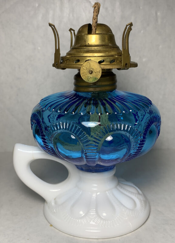 Title (ebay affiliate link): IMPERIAL SAPPHIRE BLUE & MILK GLASS ZIPPER LOOP ANTIQUE FINGER LAMP BEAUTIFUL!