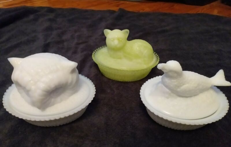 National Milk Glass Collectors Society covered dish lot Owl Bird fluorescent cat