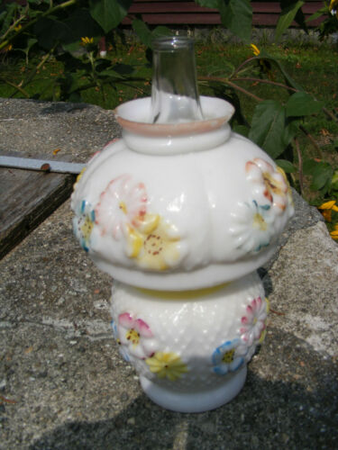 ANTIQUE MILK GLASS HANDPAINTED MINIATURE OIL LAMP WITH ORIGINAL BURNER & Chimney