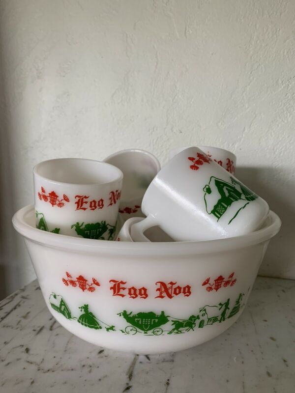 Title (ebay affiliate link): Vintage Hazel Atlas Milk Glass Christmas Egg Nog Bowl 7Mugs Cups Punch Set