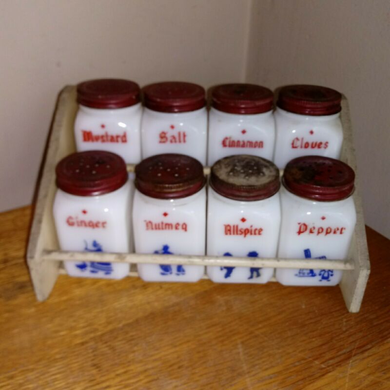 Title (ebay affiliate link): Vintage MILK GLASS set of 10 Dove McKee SPICE JARS, SHAKERS, RACK Dutch Motif
