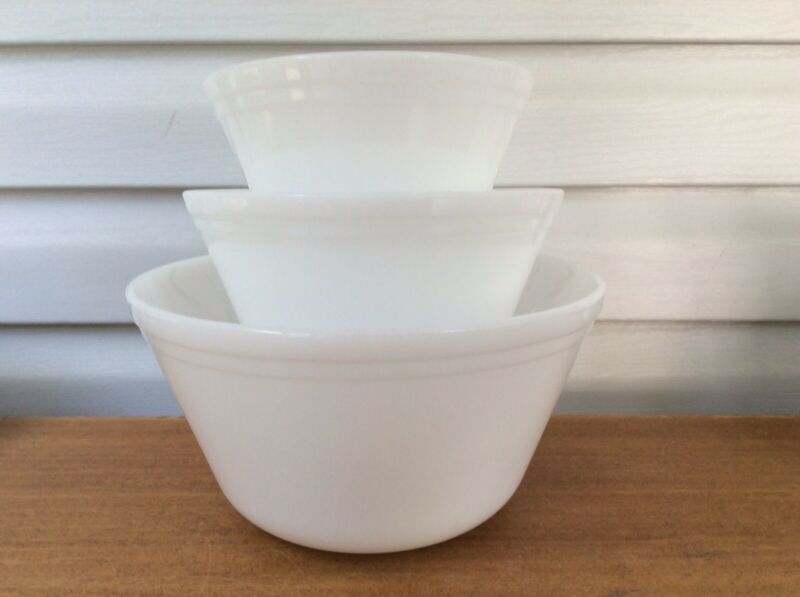 Title (ebay affiliate link): 3 Vintage Federal White Milk Glass Oven Ware Mixing Bowls Double Band F Shield