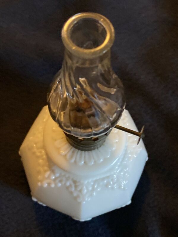 Title (ebay affiliate link): VINTAGE SM. MILK GLASS OIL LAMP W/TWISTED GLASS HURRICANE SHADE/ORNATE DETAILS