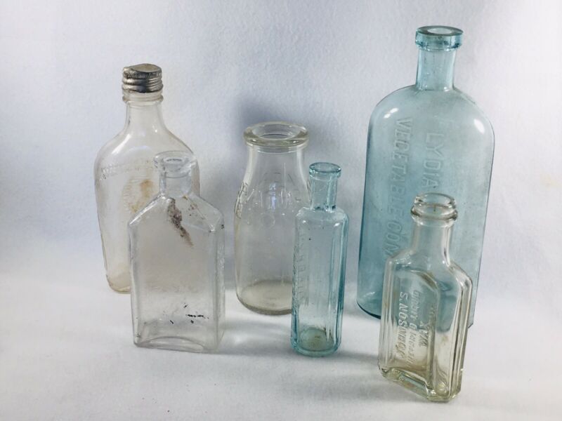 Lot Of 6 Vintage Glass Bottles Medicine & Milk Bottle