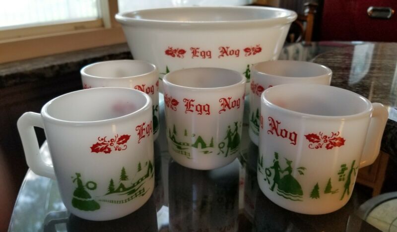 Title (ebay affiliate link): Vintage Hazel Atlas Milk Glass Christmas EggNog Bowl & 5 Mugs Cups Punch Set