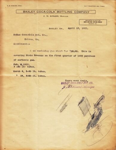Title (ebay affiliate link): BAXLEY COCA-COLA BOTTLING CO, Letterhead Dated APRIL 12 1922 98 YEARS OLD