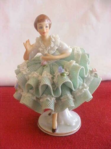 Title (ebay affiliate link): Antique Dresden German Porcelain GREEN Lace Lady Figurine signed Dresden w/Crown