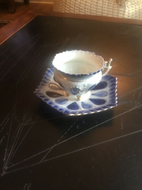 Blue & White Vintage Footed Cup & Saucer Gold Trim & Design Number On Bottom