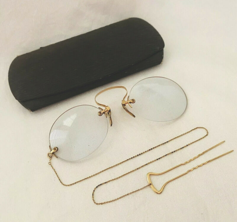 Title (ebay affiliate link): ANTIQUE Gold Tone / Filled? PINCE Nez Tinted SPECTACLES w/ Hairpin Chain & Case