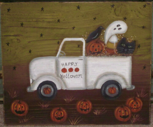 Title (ebay affiliate link): *~*PRIMITIVE*~* HP FOLK ART HALLOWEEN TRUCK * PUMPKINS * CAT *~* RECLAIMED WOOD