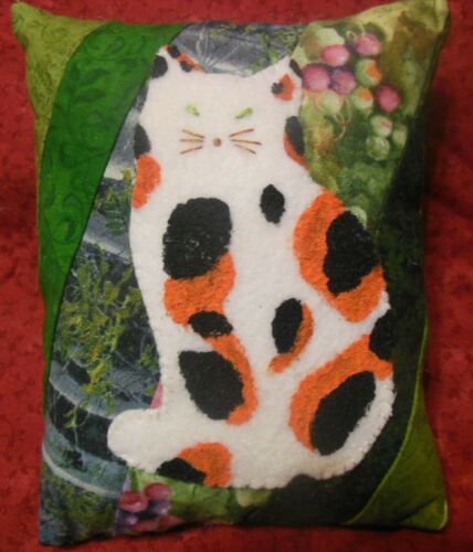 Primitive Stitchery Little Calico Cat on Green Patchwork Pillow