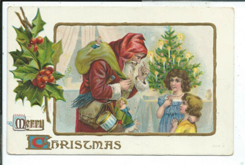 Postcard Holiday Christmas Red Suited Santa Claus With Toys Girls