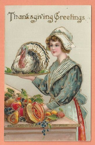Vintage Thanksgiving Postcard, Pilgrim Lady, White Turkey, GFI, NU