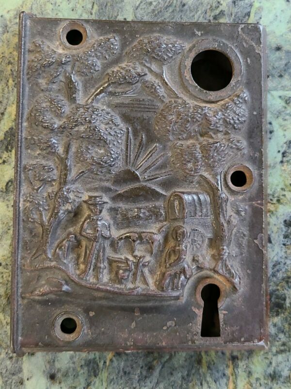 Title (ebay affiliate link): Antique Cast Lock Plate With Farm Scene Pat. Date August 10, 1858