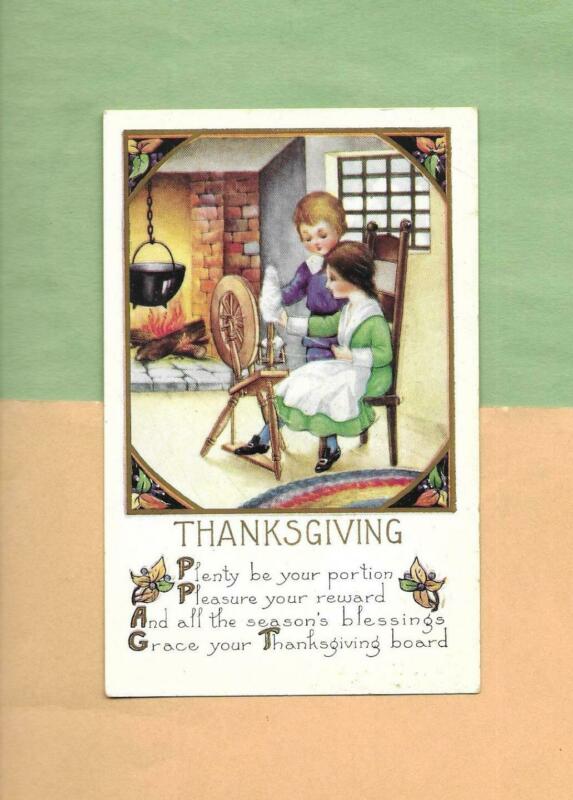 Title (ebay affiliate link): PILGRIM COUPLE, SPINNING WHEEL On Colorful Vintage Unused THANKSGIVING Postcard
