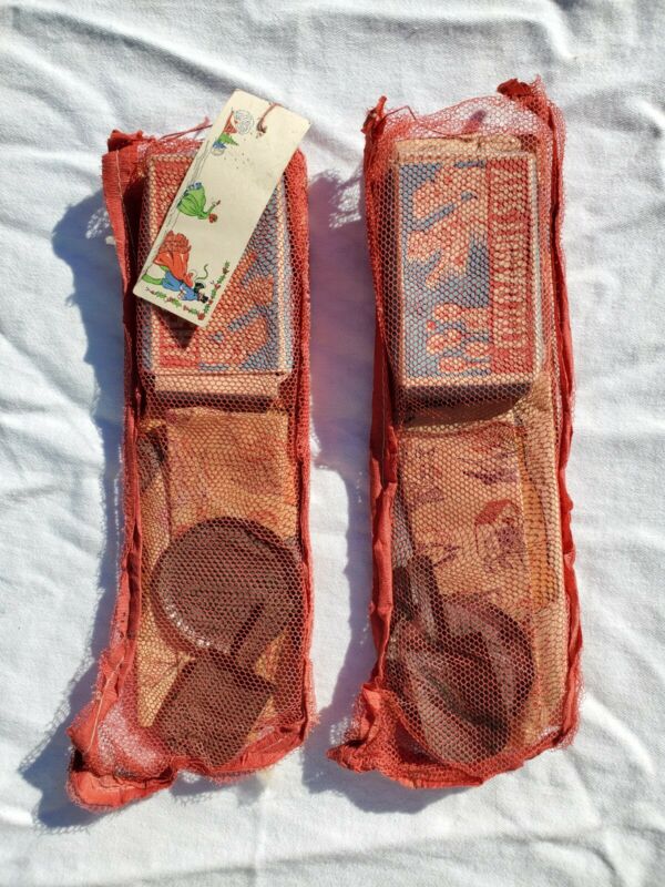 Two Vintage Mesh Children''s Christmas Stockings metal toys, Paper Doll 1945-50