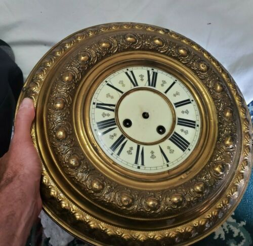 Antique Victorian 1850 Key Wind Large 14" Brass Porcelain French Wall Clock Wood