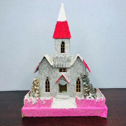 Title (ebay affiliate link): 1940s Christmas Village Cardboard Putz House or Church w/ Shrubs Unmarked GUC