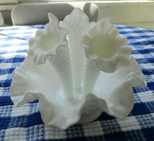 Title (ebay affiliate link): VINTAGE FENTON HOBNAIL MILKGLASS 4 PIECE HORN EPERGNE, LOVELY W NO ISSUES!