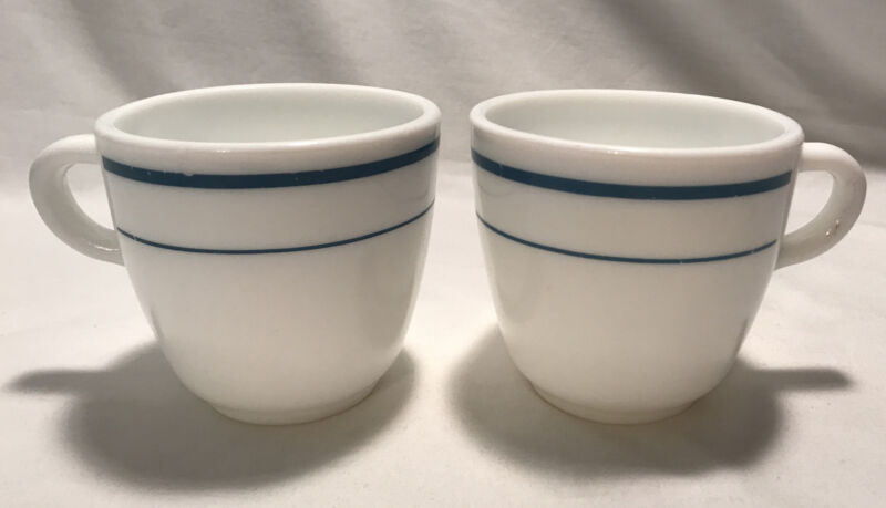 Title (ebay affiliate link): 2 VTG ANCHOR HOCKING ANCHORWARE 910 WHITE MILK GLASS MUG CUP TEAL BLUE STRIPES