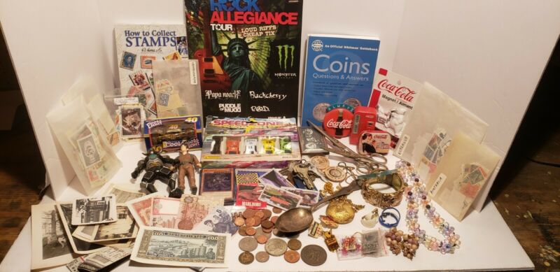 Title (ebay affiliate link): Junk Drawer Lot of Misc. Items coins antiques stamps jewelry action figure coke