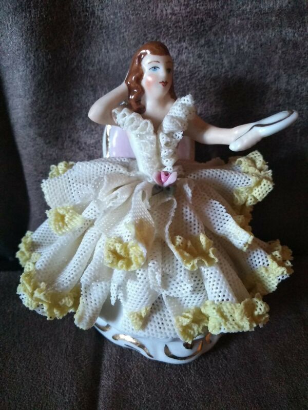 PG, DRESDEN, GERMANY LADY FIGURINE, SITTING, LACE DRESS, 3 1/2"