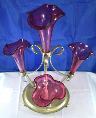 ANTIQUE EPERGNE 4 HORNS, CRANBERRY Glass Art NOUVEAU Style STAND LOOK!!