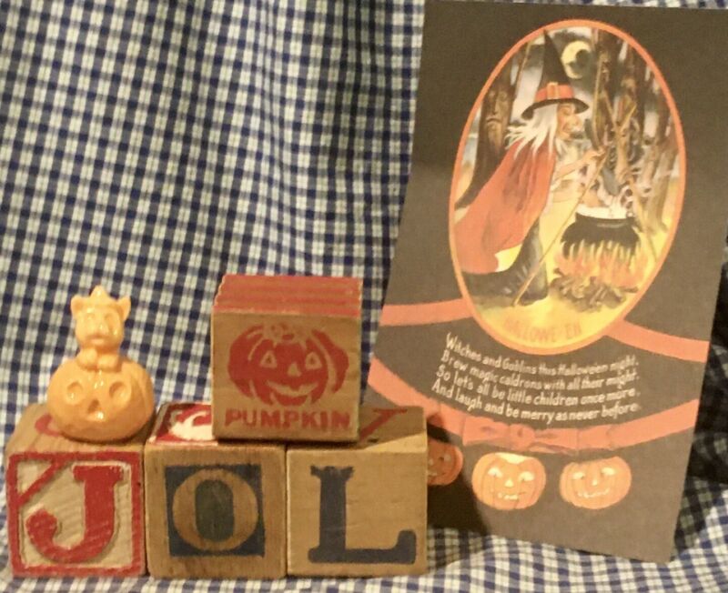 Title (ebay affiliate link): Vintage Toy ABC illus JOL Wood Blocks & WADE Cat In Pumpkin Figure -Halloween