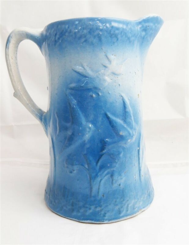 Rare Antique 1800''s Blue Love Bird Salt Glazed Pottery Pitcher 8"