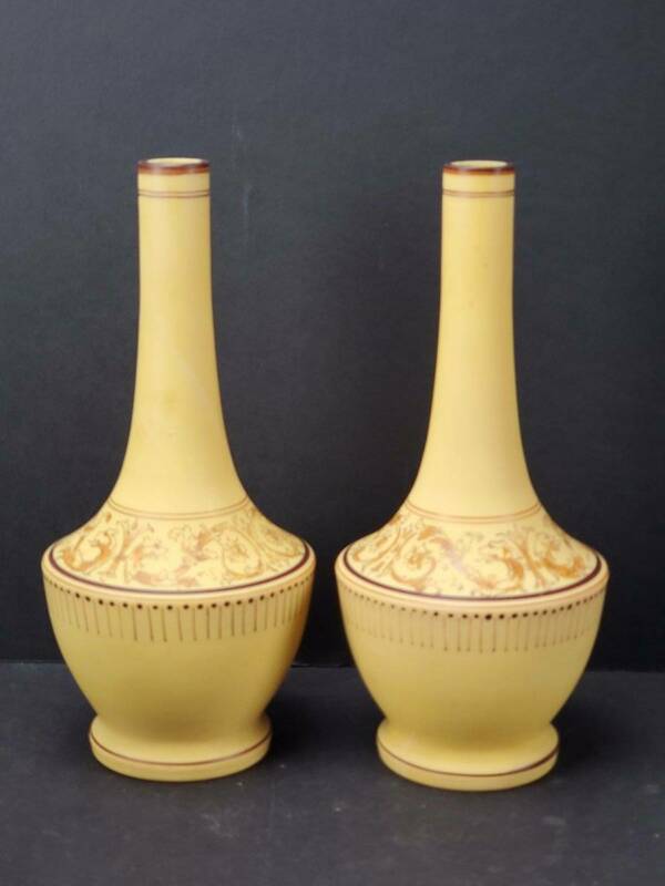 PAIR ANTIQUE BRISTOL HAND-PAINTED SATIN MUSTARD GLASS BUD VASES