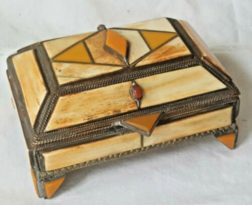 Title (ebay affiliate link): Vintage Art Deco Exotic Wood & Brass Jeweled Trinket Jewelry Box Chest Lovely