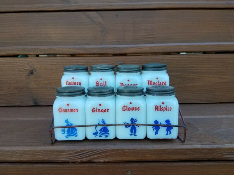 Title (ebay affiliate link): VINTAGE SET OF 8 MILK GLASS DUTCH THEME SPICE JARS - SHAKERS + RED WIRE RACK