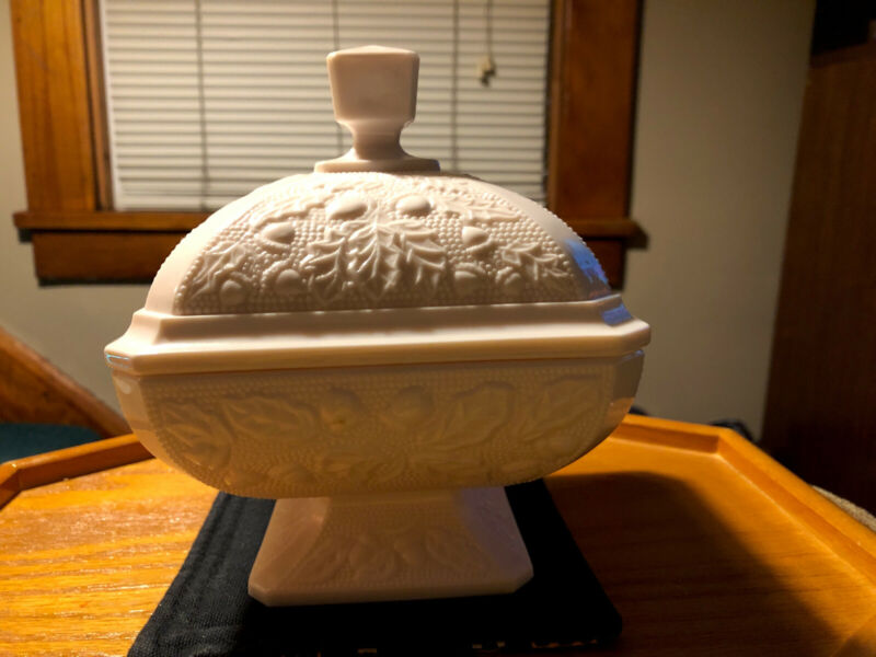 Title (ebay affiliate link): VTG JEANNETTE SHELL PINK MILK GLASS ACORN AND LEAF PATTERN COVERED CANDY DISH