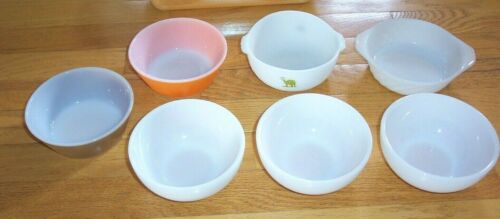 Lot of 7 ANCHOR HOCKING & FIRE KING Milk Glass Desert Custard Bowls, 1 Grog Dino