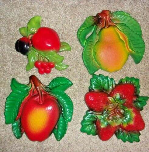 Title (ebay affiliate link): 4 Vtg pcs Chalkware Fruit Wall Hangings Kitchen Apples Cherries Plums Strawberry