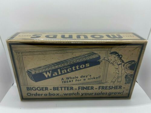 Title (ebay affiliate link): 1940s Peter Paul Mounds Collins Walnettos Retail Candy Box