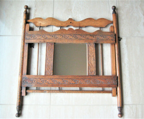 Antique Victorian Carved Pressed Oak Magazine Newspaper Rack w Mirror Wall Mount