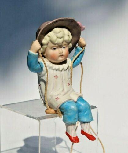 Title (ebay affiliate link): Antique Victorian Hand Painted Bisque boy in Blue White Suit, Big Hat Swinger