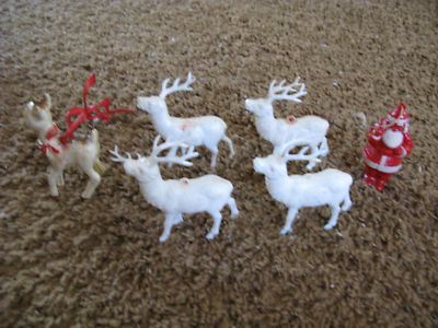 Vtg Xmas Early Plastic Santa Reindeer Rudolph Ornaments