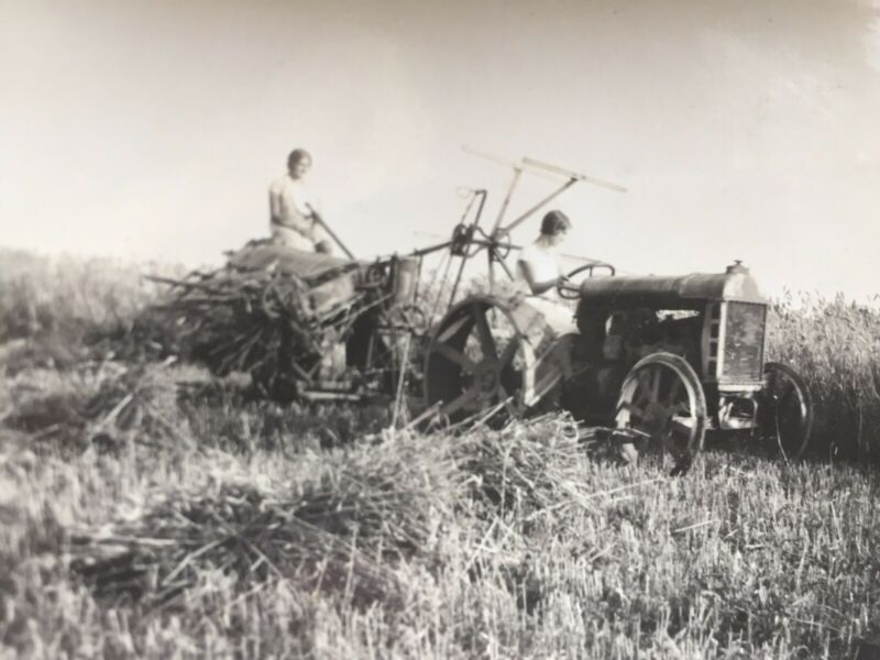 VINTAGE PHOTOGRAPH LADIES WORKING ON TRACTOR & THRESHING MACHINE FARMING RURAL