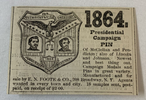 Title (ebay affiliate link): small 1864 newspaper ad ~ GEORGE B McCLELLAN+PENDLETON CAMPAIGN MEDAL button