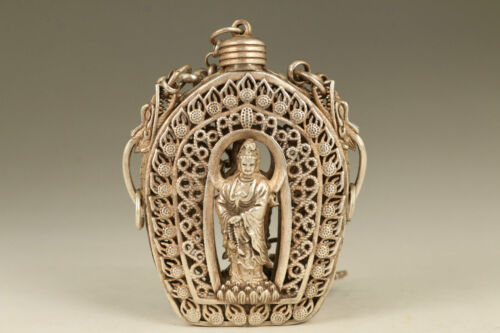 Buddha Old Copper plated silver Handmade Hollow out kwan-yin snuff bottle box