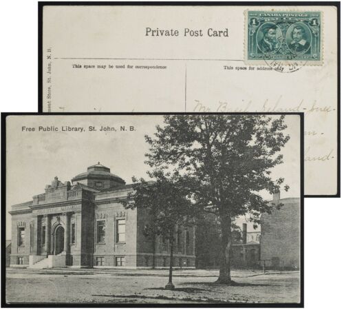 Title (ebay affiliate link): Free Public Library St John New Brunswick, collotype. Postmarked RPO 1908 AU